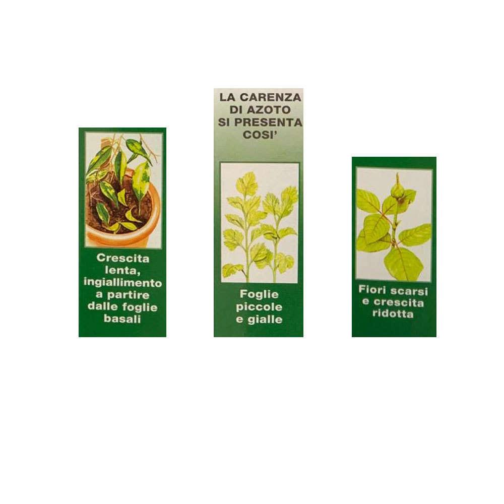 Il formulato previene e cura la carenza di Azoto nelle piante dell’orto e del giardino. La carenza di azoto si manifesta con una crescita stentata, le foglie più vecchie (basali) assumono un colore verde pallido con successivo ingiallimento e disseccamento a partire dai bordi. Nelle piante da frutto e negli ortaggi si ha una precoce caduta dei frutti. Con le somministrazioni di AZOTO si avrà un maggiore sviluppo della pianta, la formazione di nuovi germogli, il miglioramento della fotosintesi e del colore delle foglie, abbondante produzione di fiori, frutti e ortaggi.